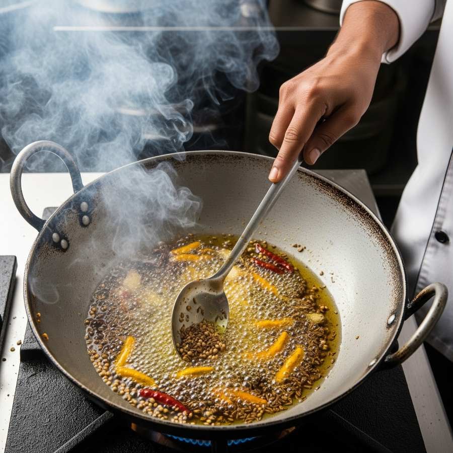 জিরে, সর্ষে, মেথি, ধনে দানার মতো মশলার ভিতরে প্রাকৃতিক তেল থাকে। গরম তেলে দিলে সেই তেলের ঘ্রাণ বেরোতে থাকে। কিন্তু বেশি সময় ভাজলে তেল পুড়ে গিয়ে স্বাদ নষ্ট হয়, আর পোড়া গন্ধ খাবারে ছড়িয়ে পড়ে। তাই গন্ধ বেরোনোর সঙ্গে সঙ্গেই রান্নার পরের ধাপ শুরু করা জরুরি।